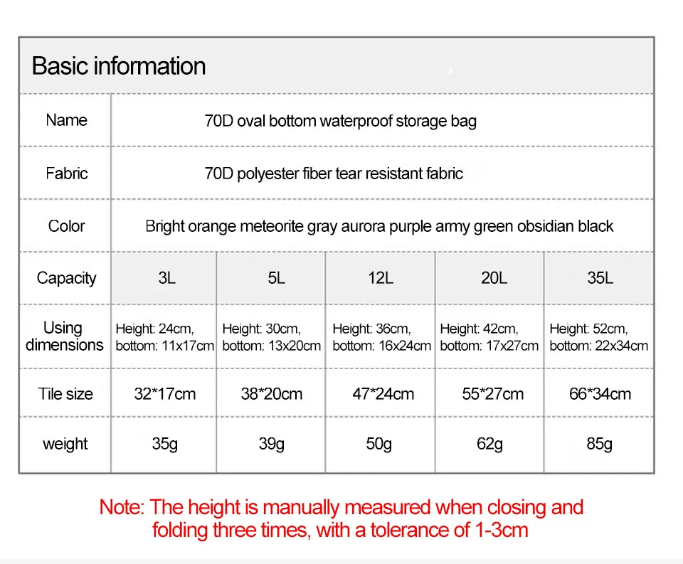 Keep your gear safe and dry no matter the conditions with this rugged yet ultralight waterproof dry sack—available in 3 L, 5 L, 12 L, 20 L, and 35 L sizes. Crafted from tear-resistant 70D polyester with a reliable roll-top seal, it forms a watertight barrier against rain, splashes, and accidental submersion. An oval base lets it stand upright for easy packing, while its minimalist, functional design makes it ideal for kayaking, camping, hiking, or beach adventures. Lightweight enough to slip into any backpack, this dry sack is an essential companion for outdoor enthusiasts who demand protection without bulk.